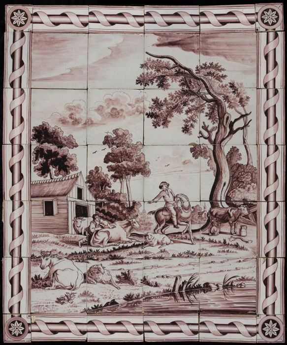 Paars tegeltableau van boerentafereel met lijst van ...