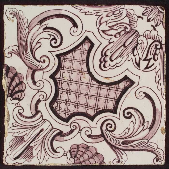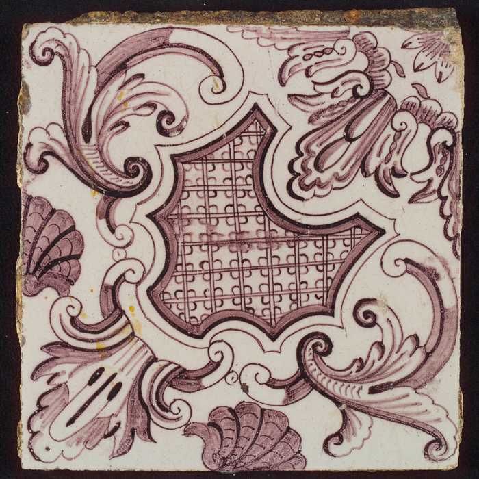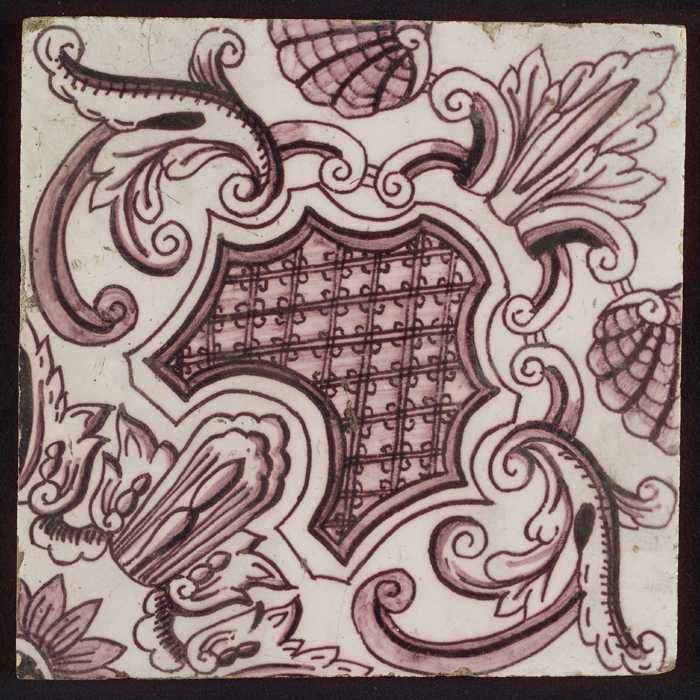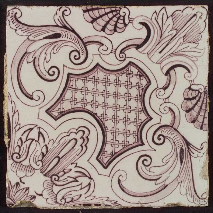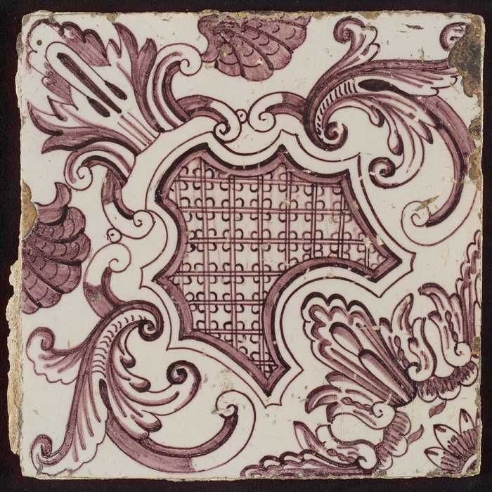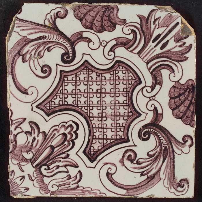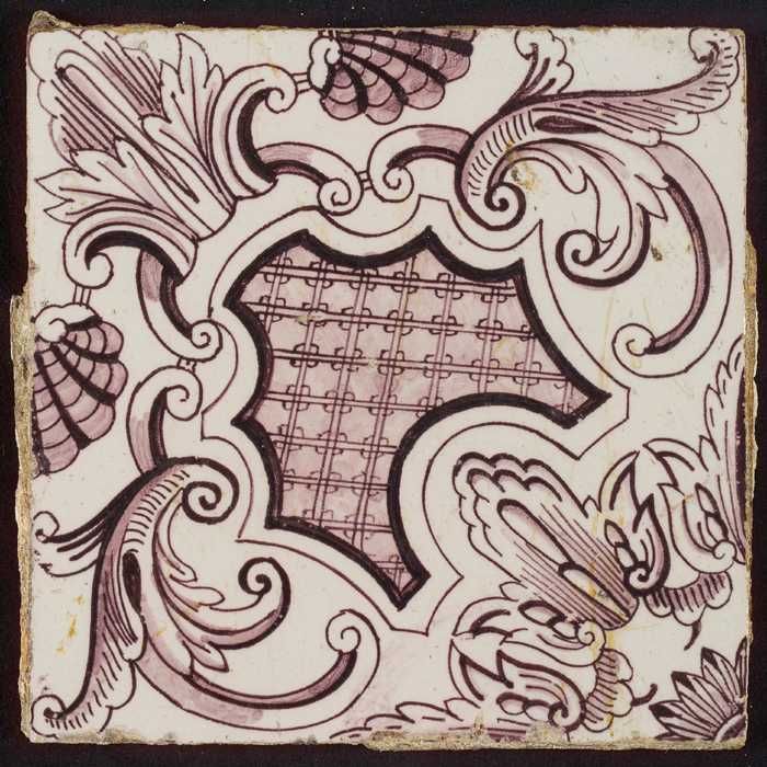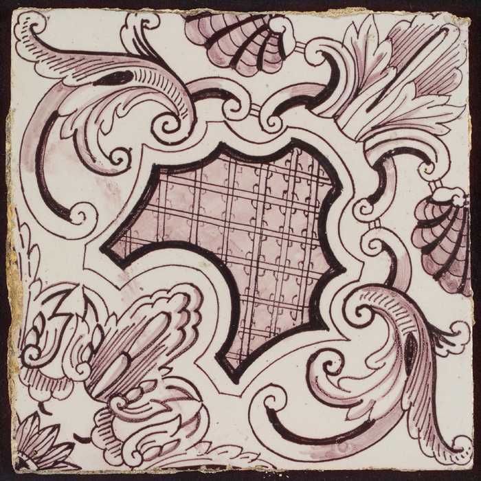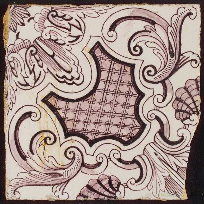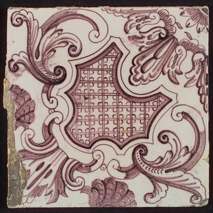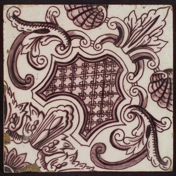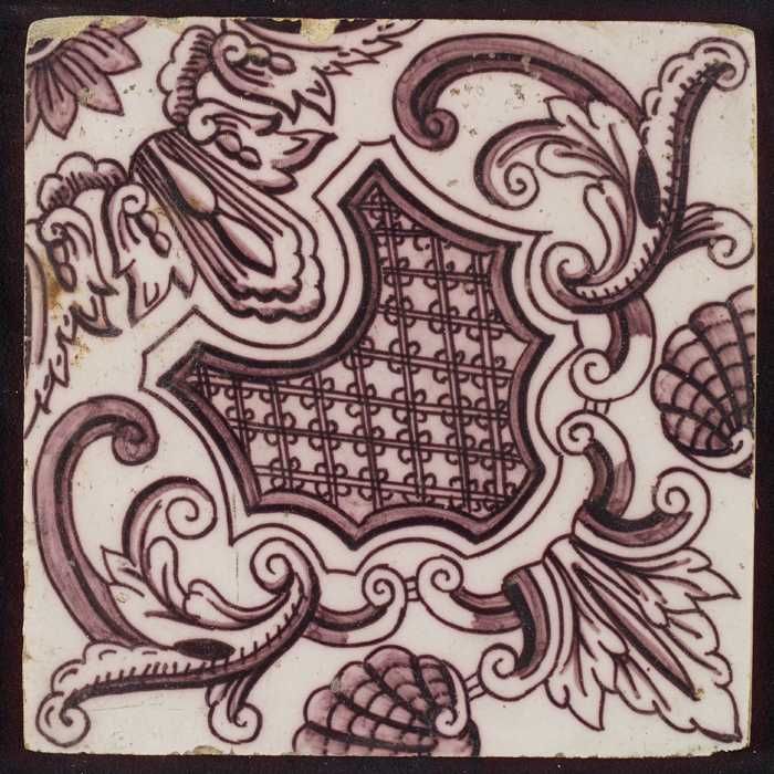 Paarse tegel uit tegelpilaster met gedeelte van vrou...