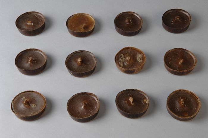 Twaalf schijfvormige bruine kaarsjes van stearine, g...