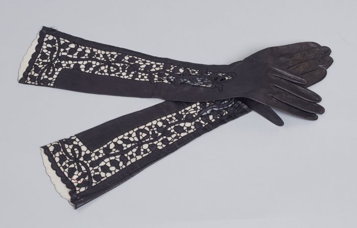 Paar ellebooglange dameshandschoenen van zwart leer,...