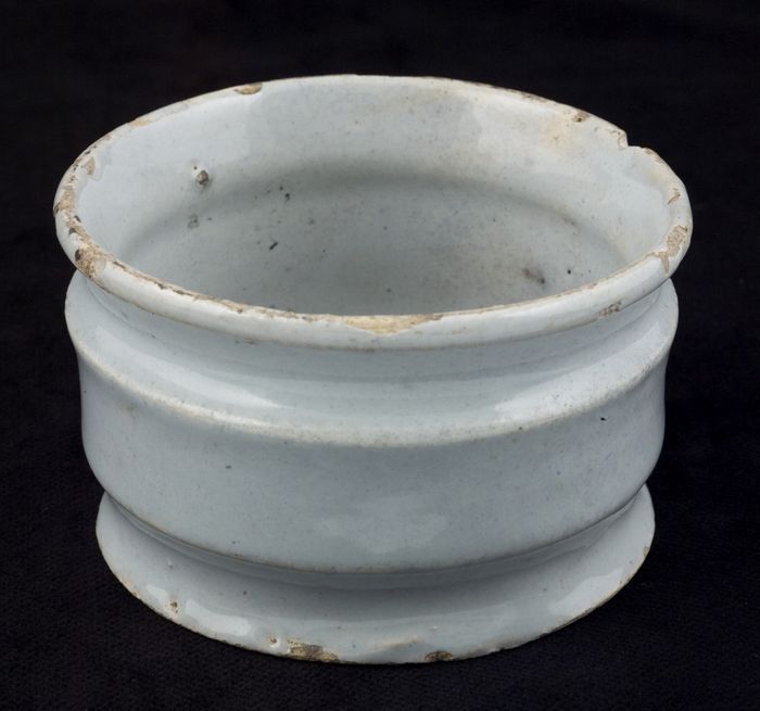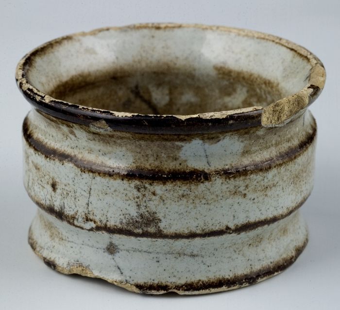 Aardewerk zalfpot, laag model, wijde bovenrand, twee...