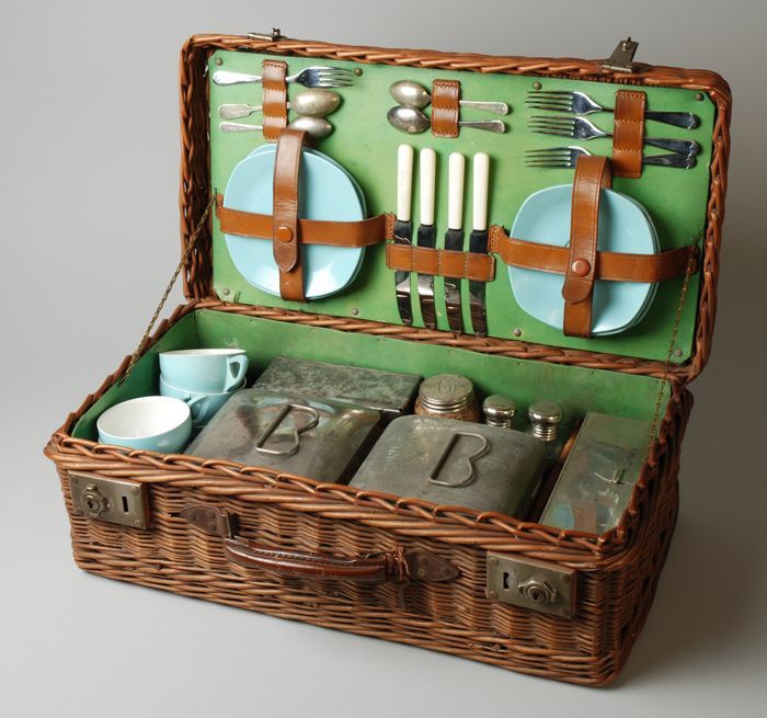 Rieten picknickmand, groene bekleding, gevuld met be...
