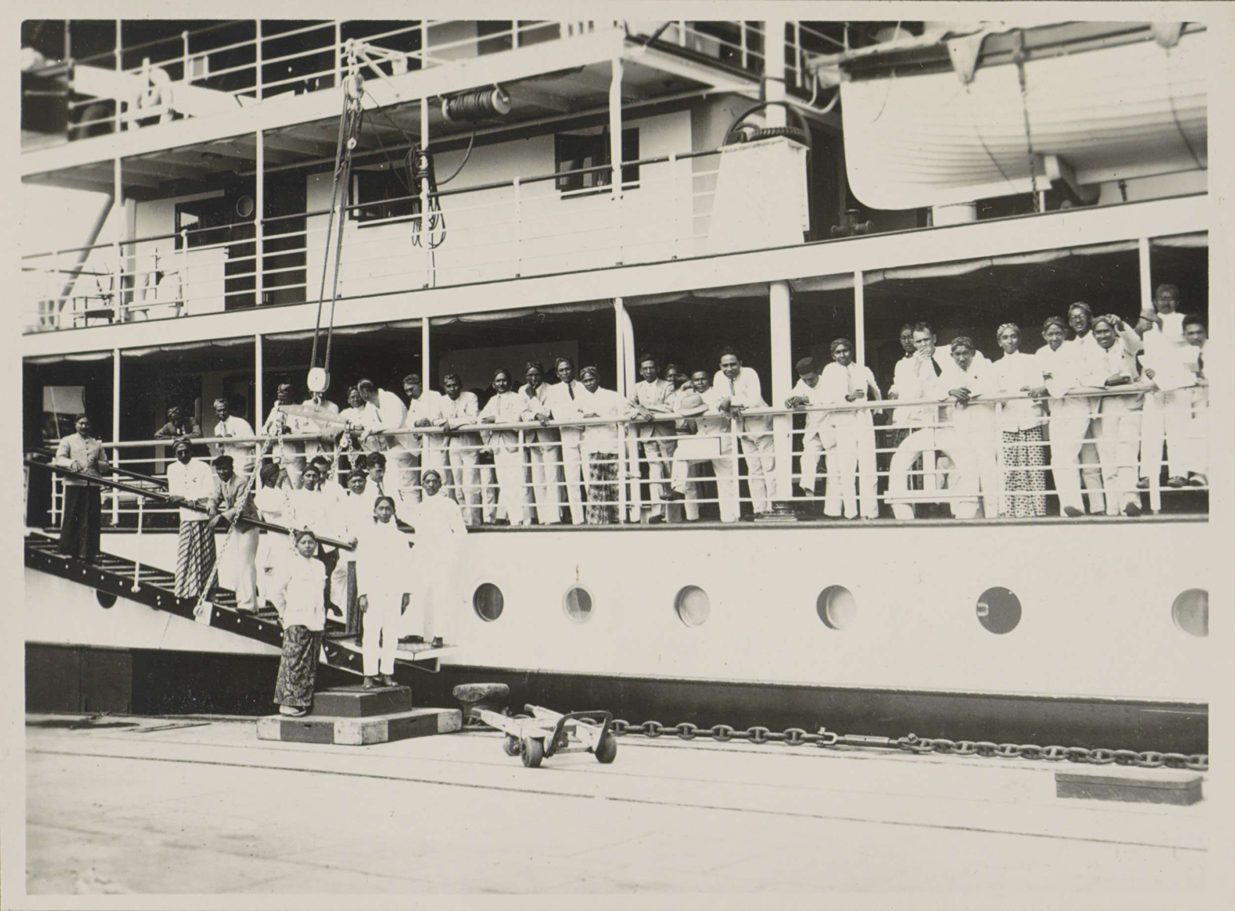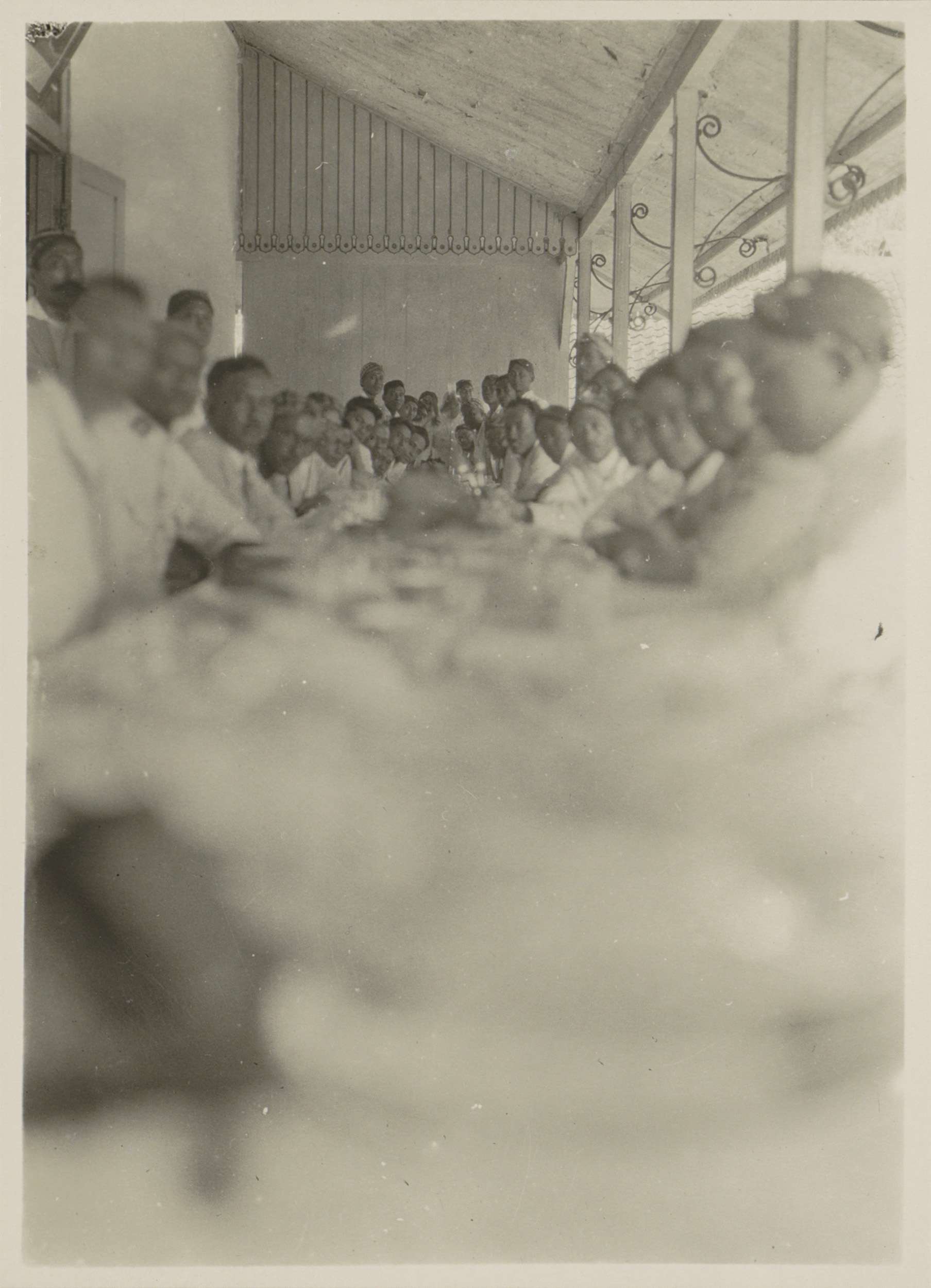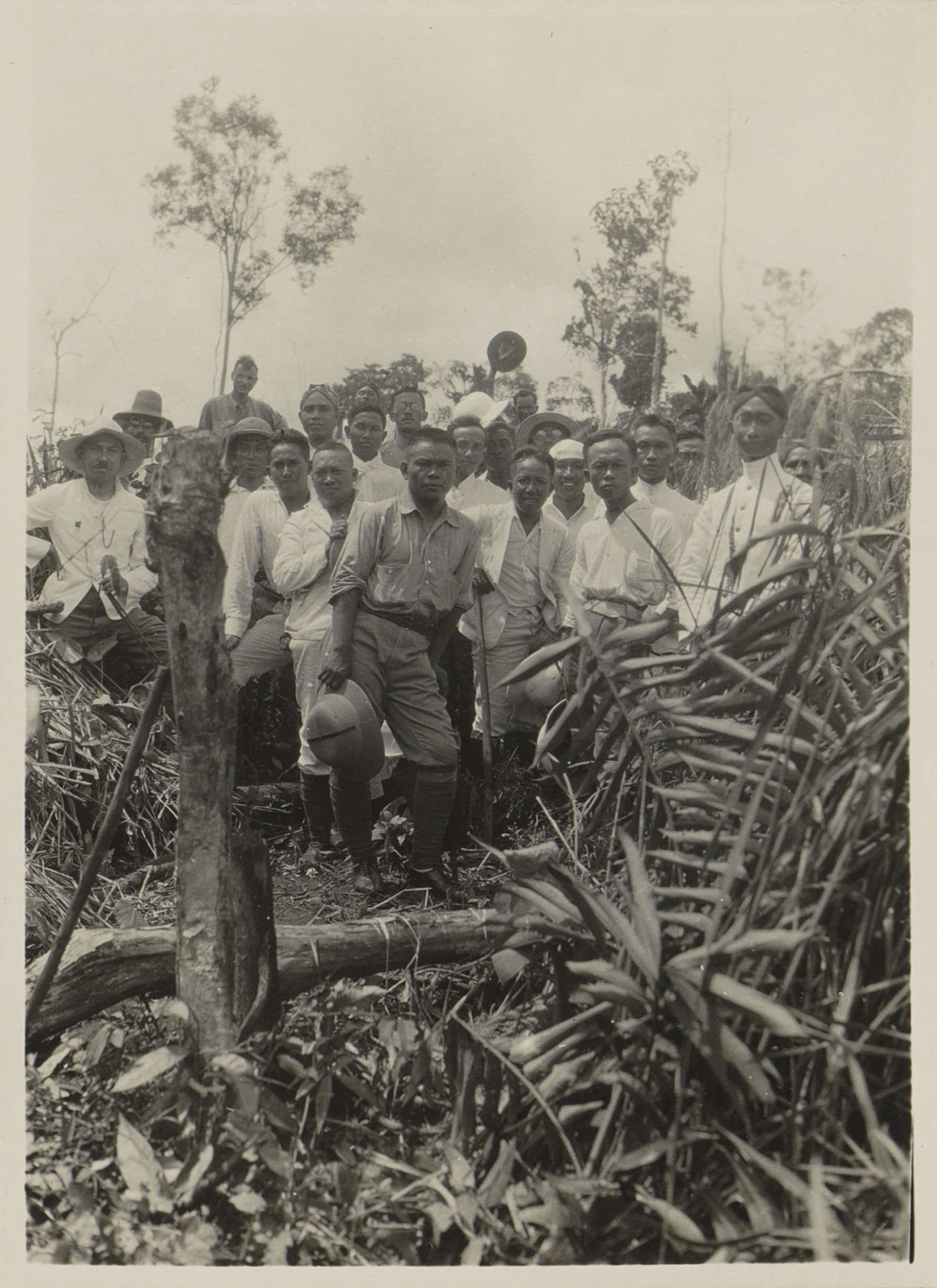 Vijf mannen in tropenkledij zittend rondom een tafel