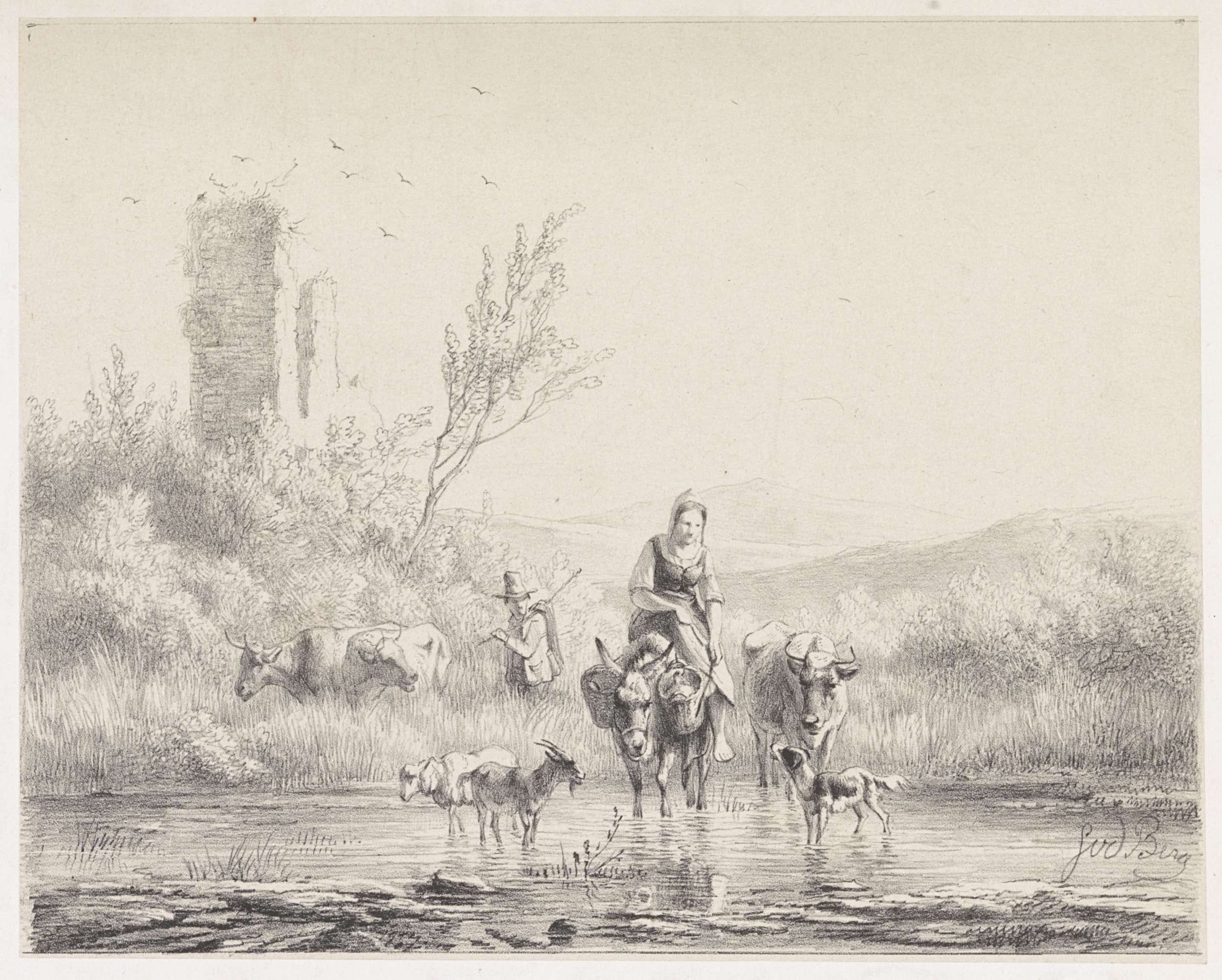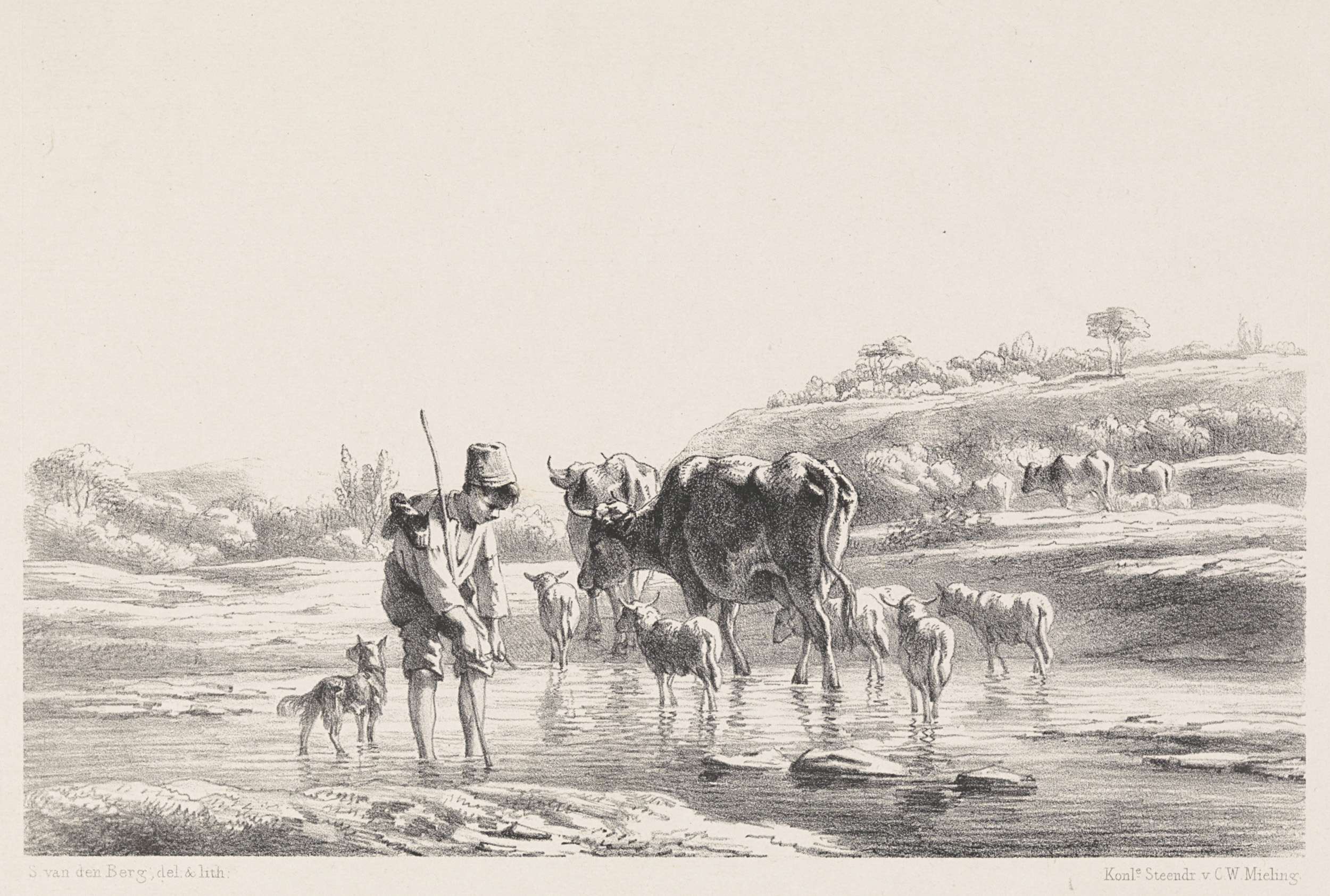 Herdersjongen met kudde in ondiep water