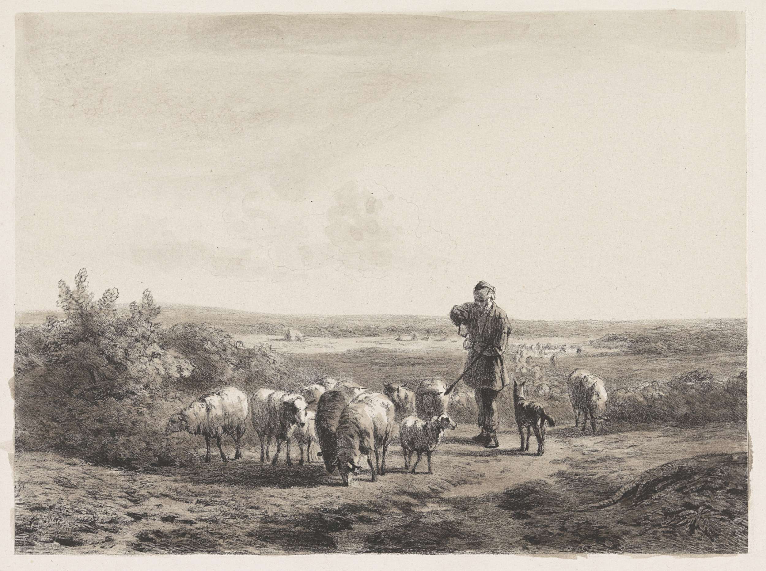 Herder met zijn schapen op de hei