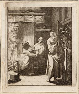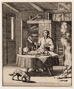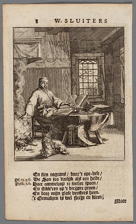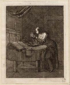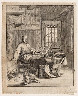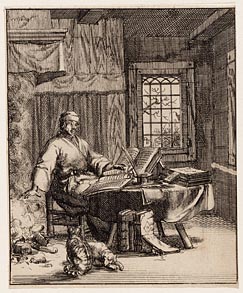 Schrijver zit met folianten aan tafel en warmt zijn ...