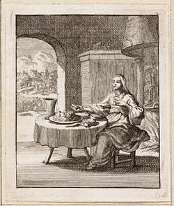 Schrijver zit aan tafel en zingt na de maaltijd uit ...