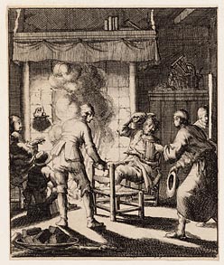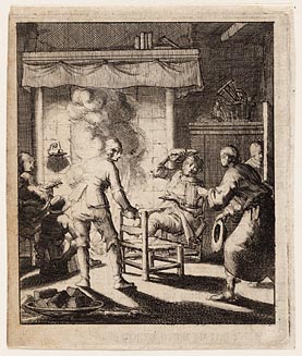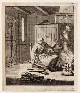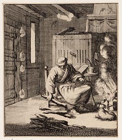 Schrijver zit op een lage stoel bij het vuur en raap...