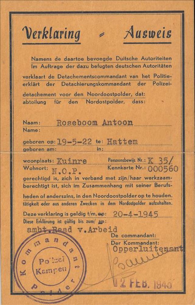 Ausweis, verklaring, voor Antoon Roseboom geboren op...
