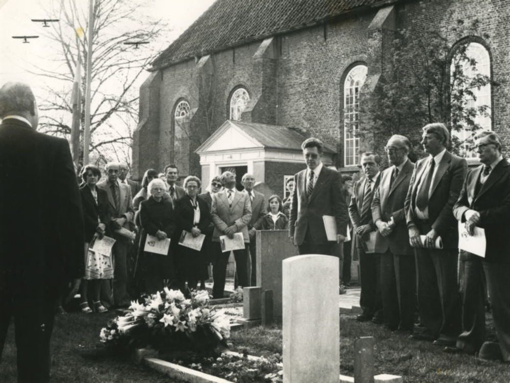 Foto van herdenking bij kerkhof met kerk met flypast...