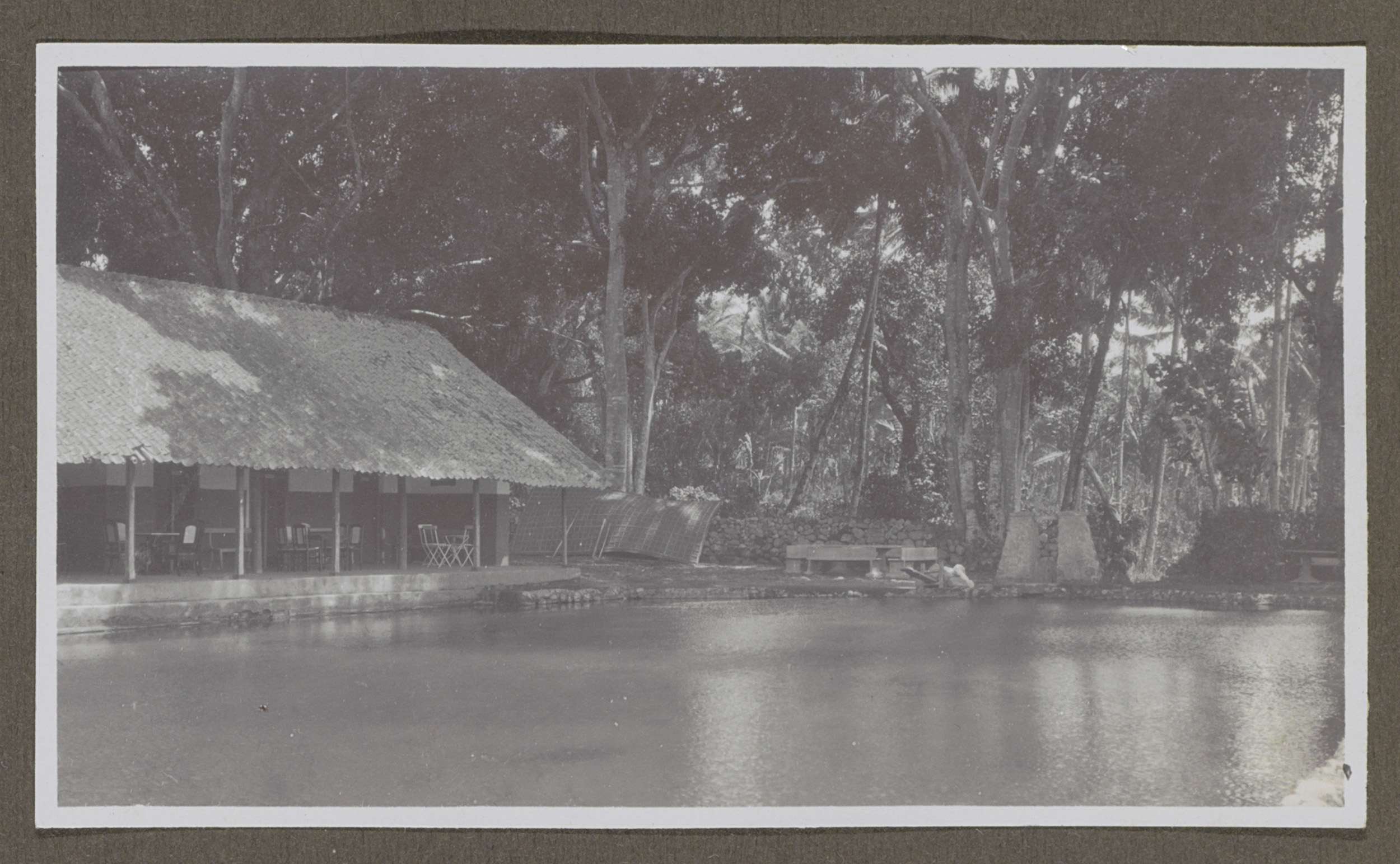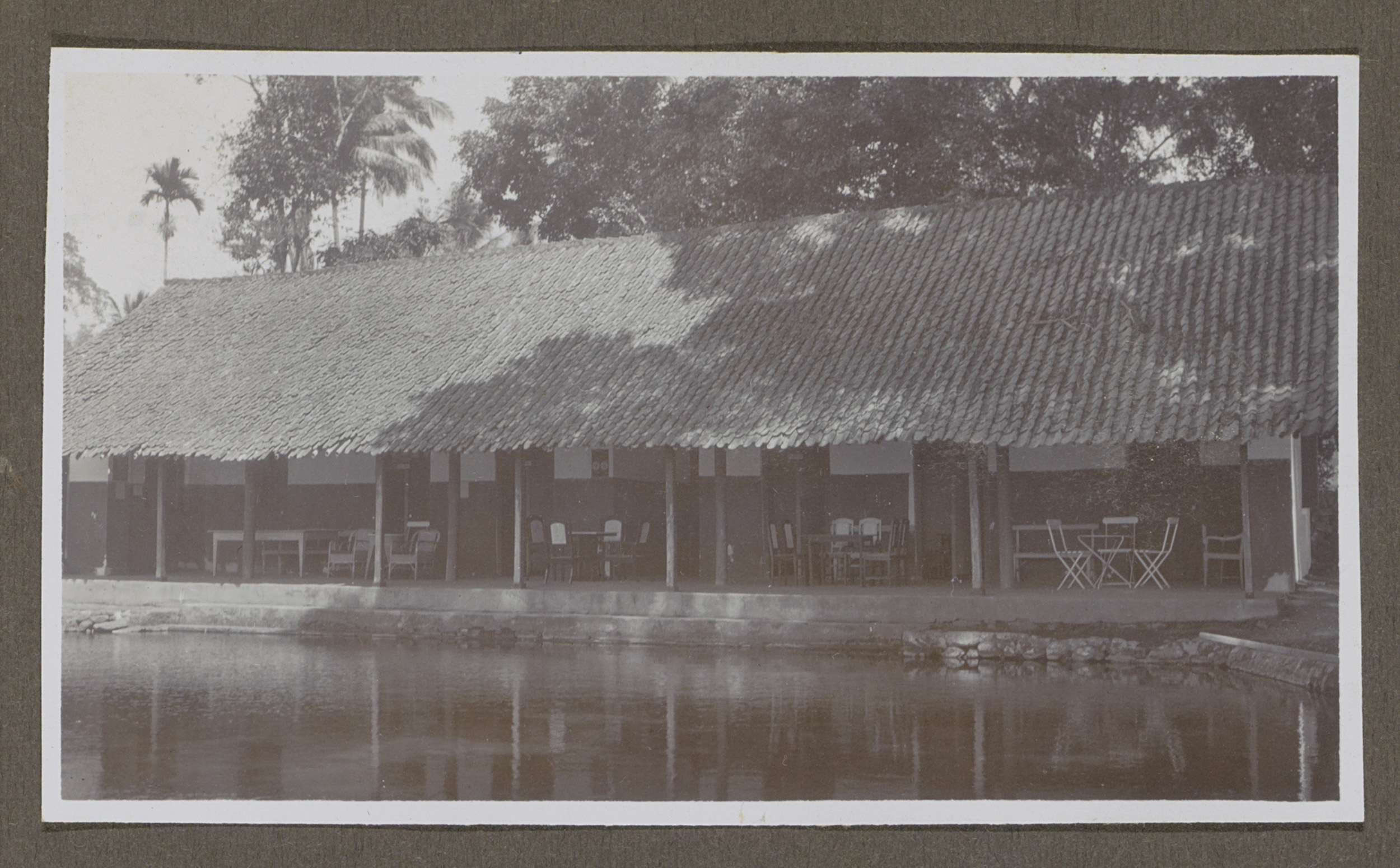 Gebouw met overdekte zitjes aan een water, mogelijk ...