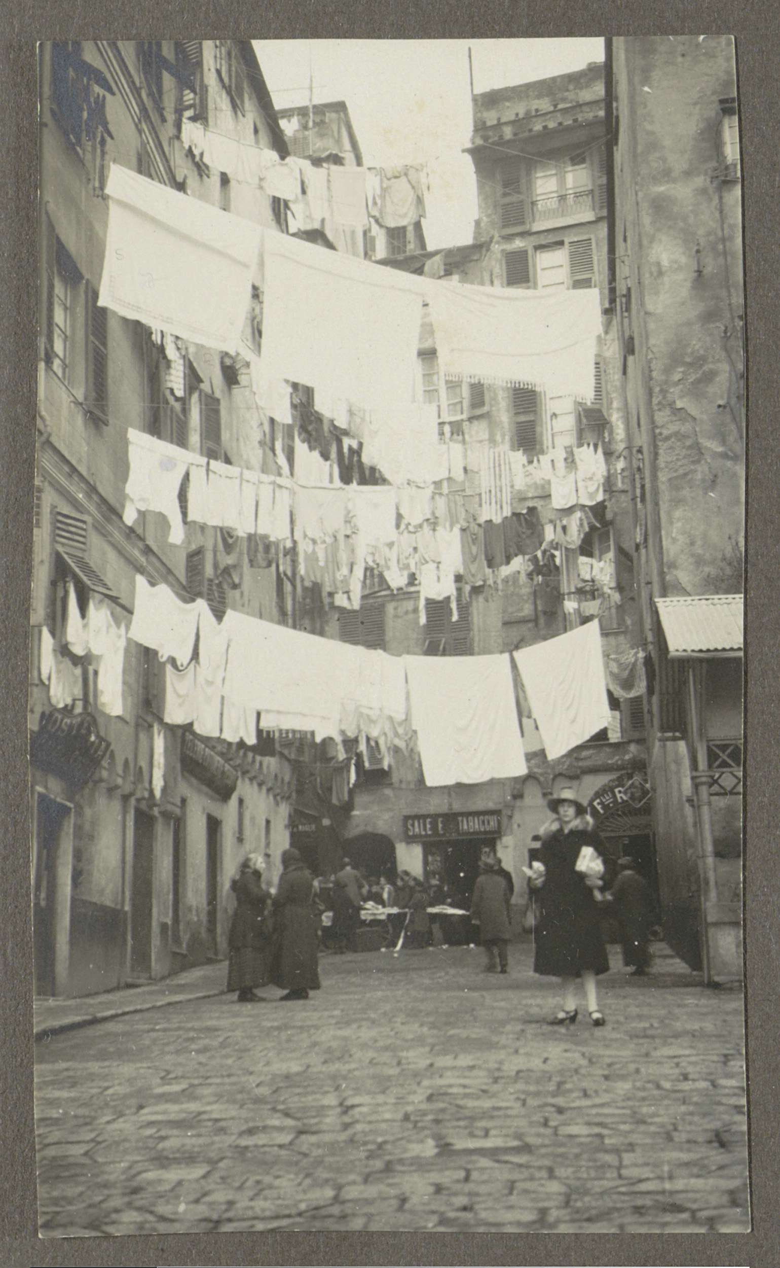 Vrouw poserend in een straat met drogend wasgoed