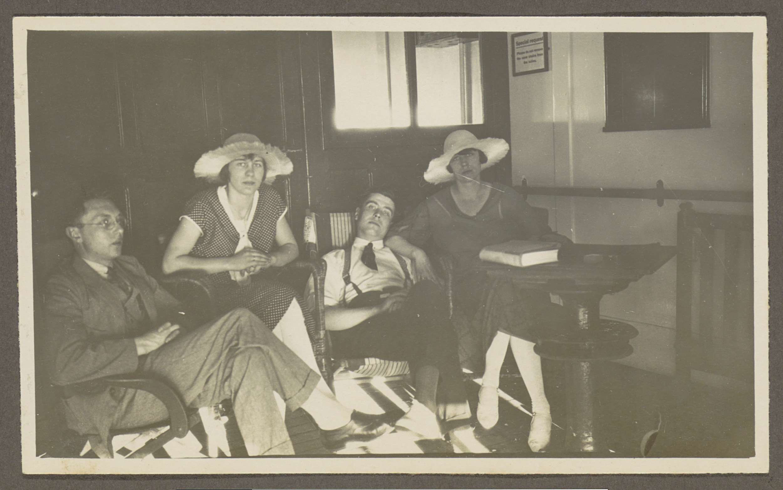 Twee mannen en twee vrouwen aan boord van een schip
