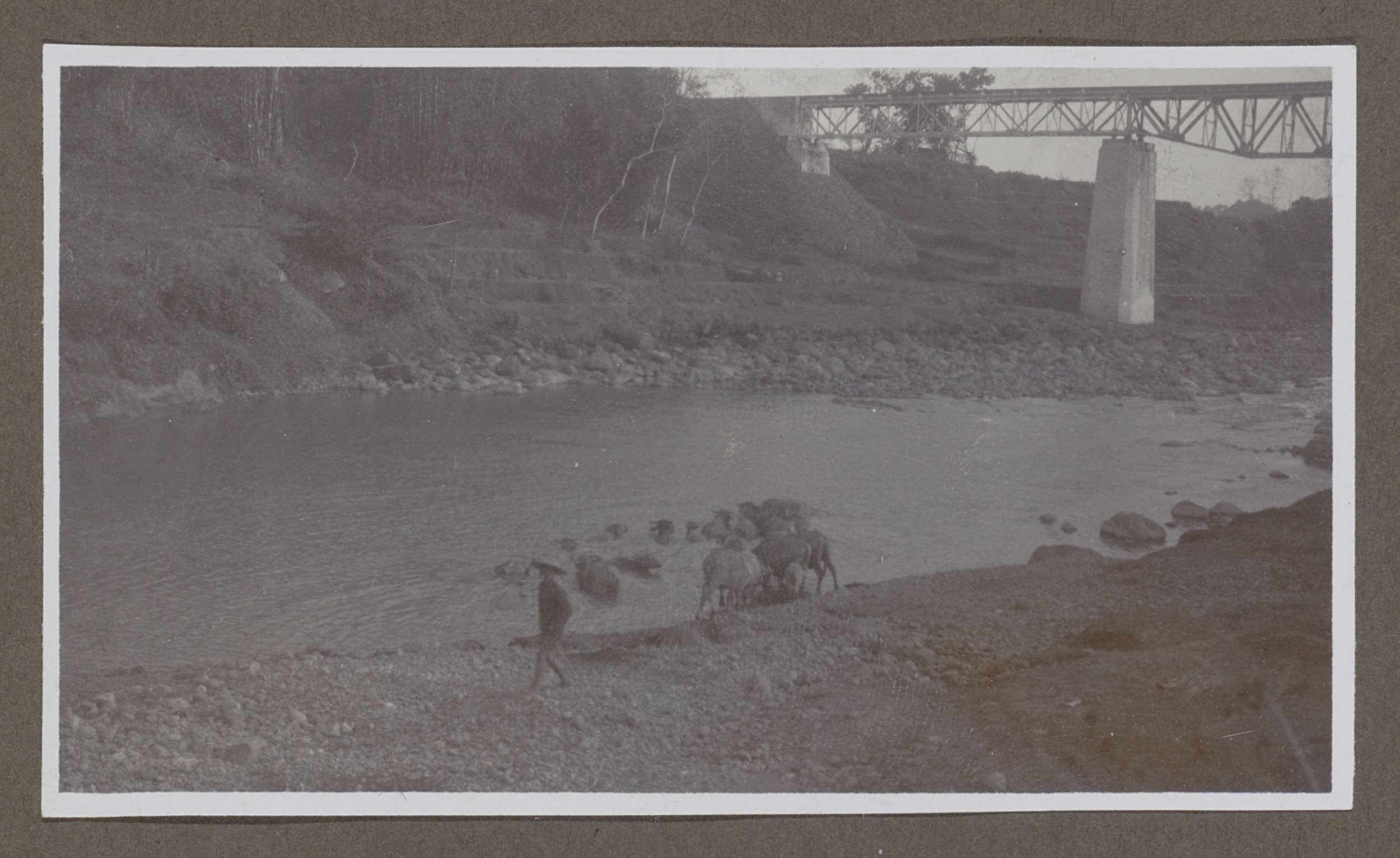 Rivier met een brug, een veehoeder en drinkend vee