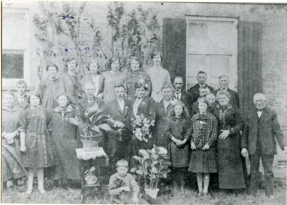 Zwart-wit foto van een familie bij een bruiloft ca. ...