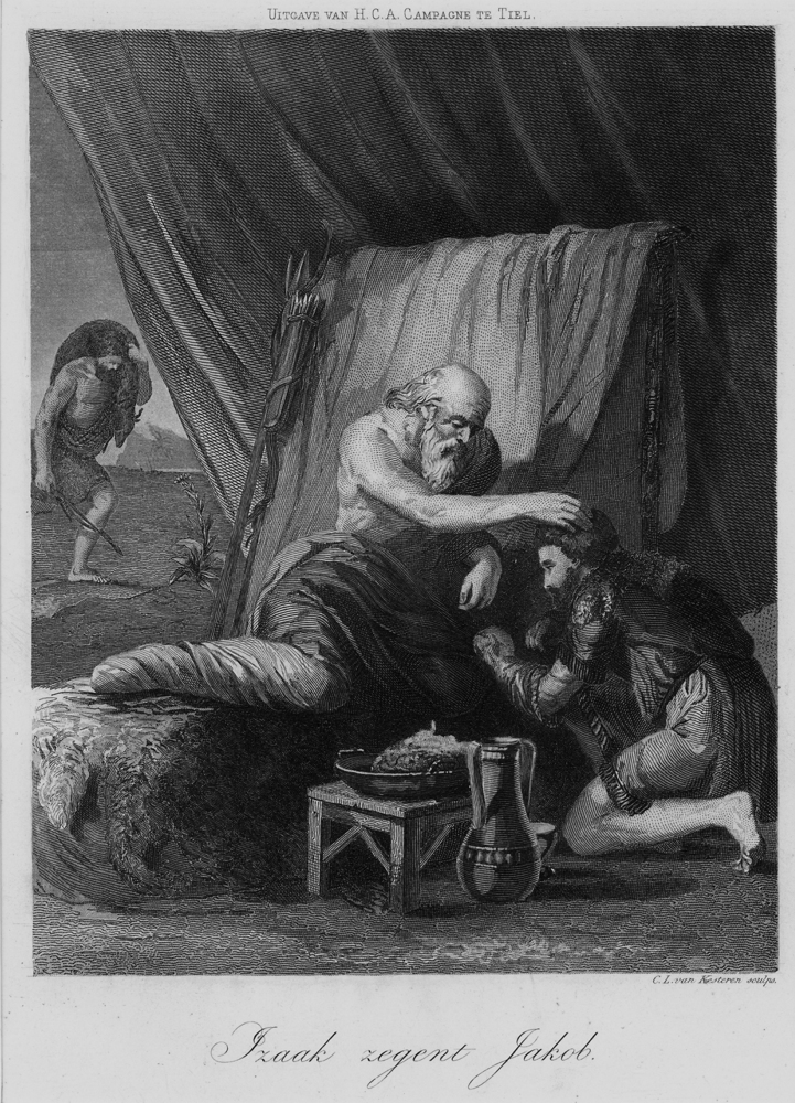 Gravure, voorstellende Izaak die Jacob zegent, verva...