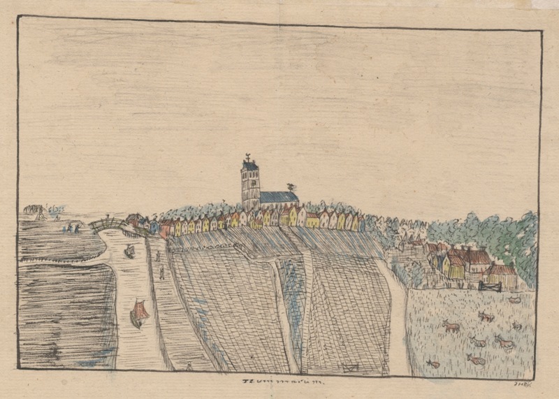 Gezicht op het dorp Baard in Baarderadeel langs de terp