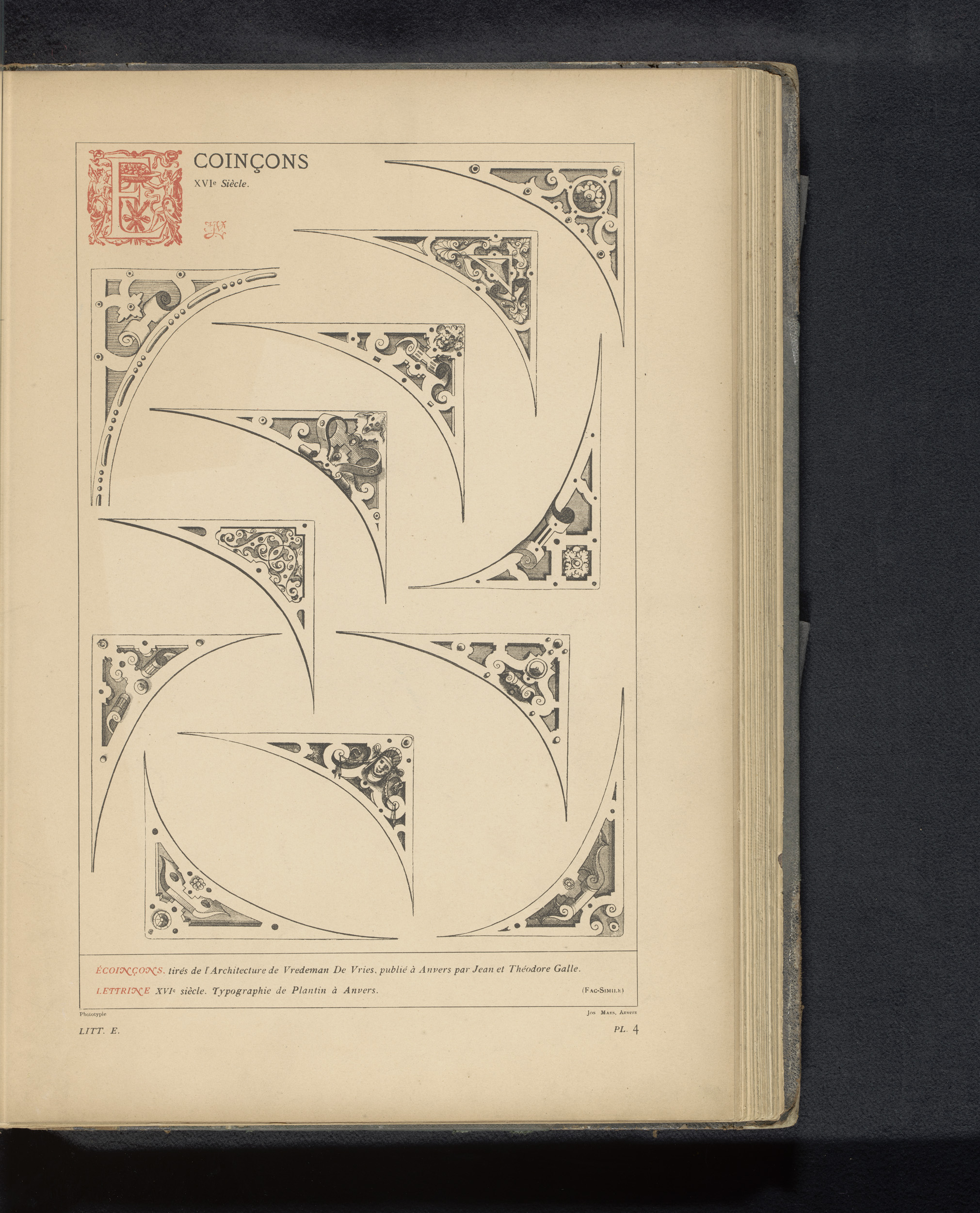 Reproductie van een prent van vijf gedecoreerde hoek...