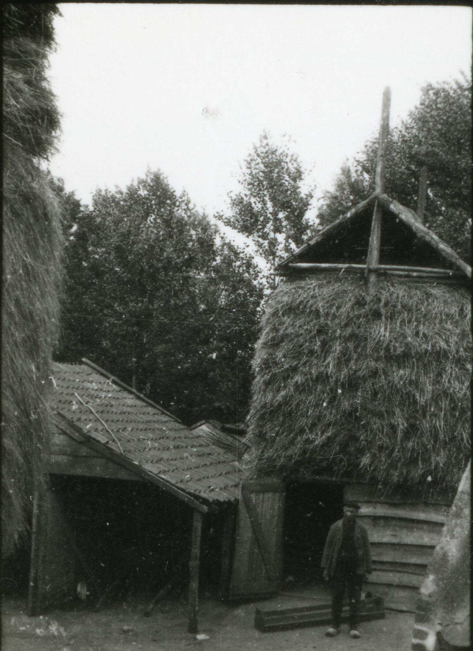 Hooibergen en schuur, Bennekom, 1934 (zwart-wit foto)