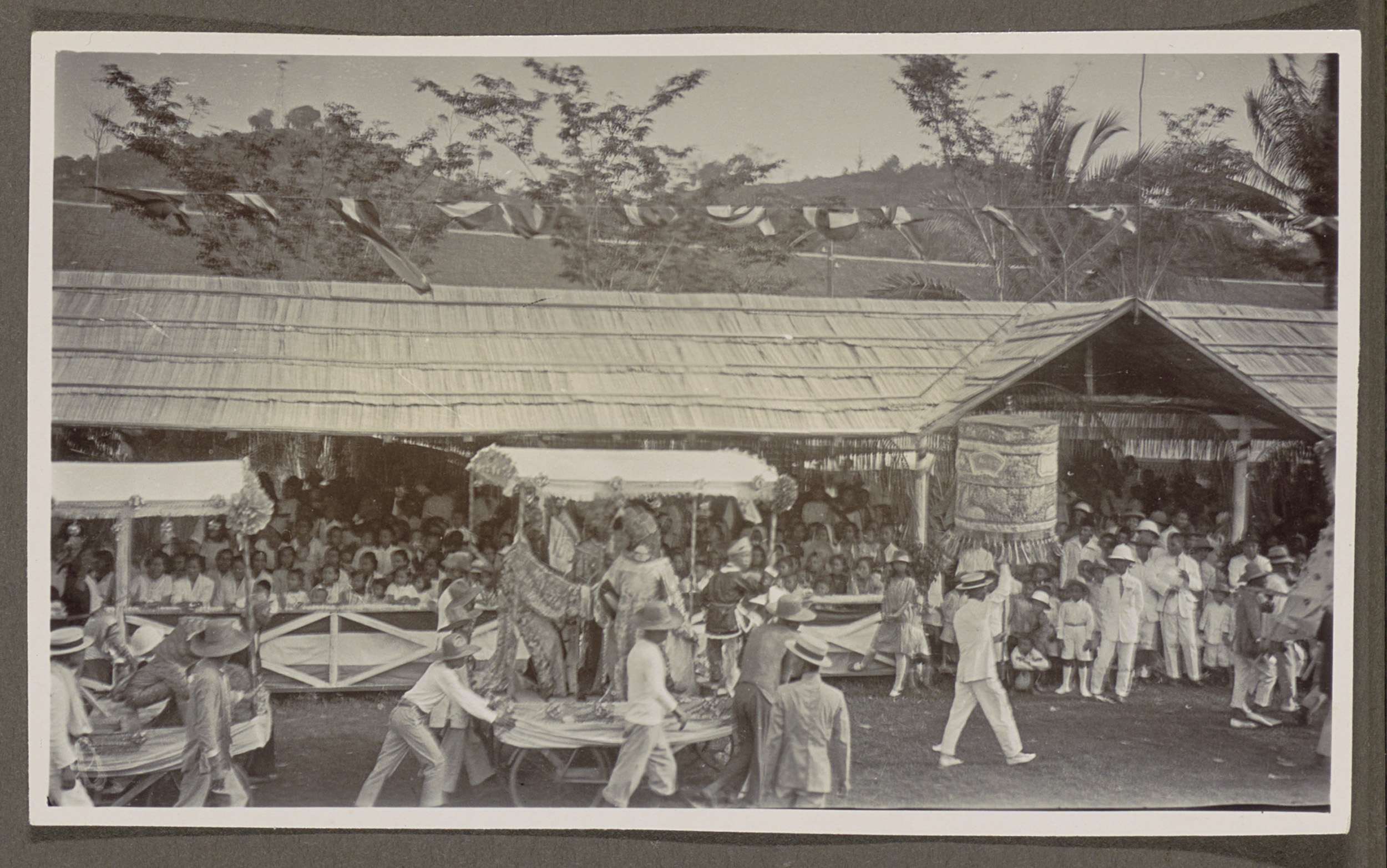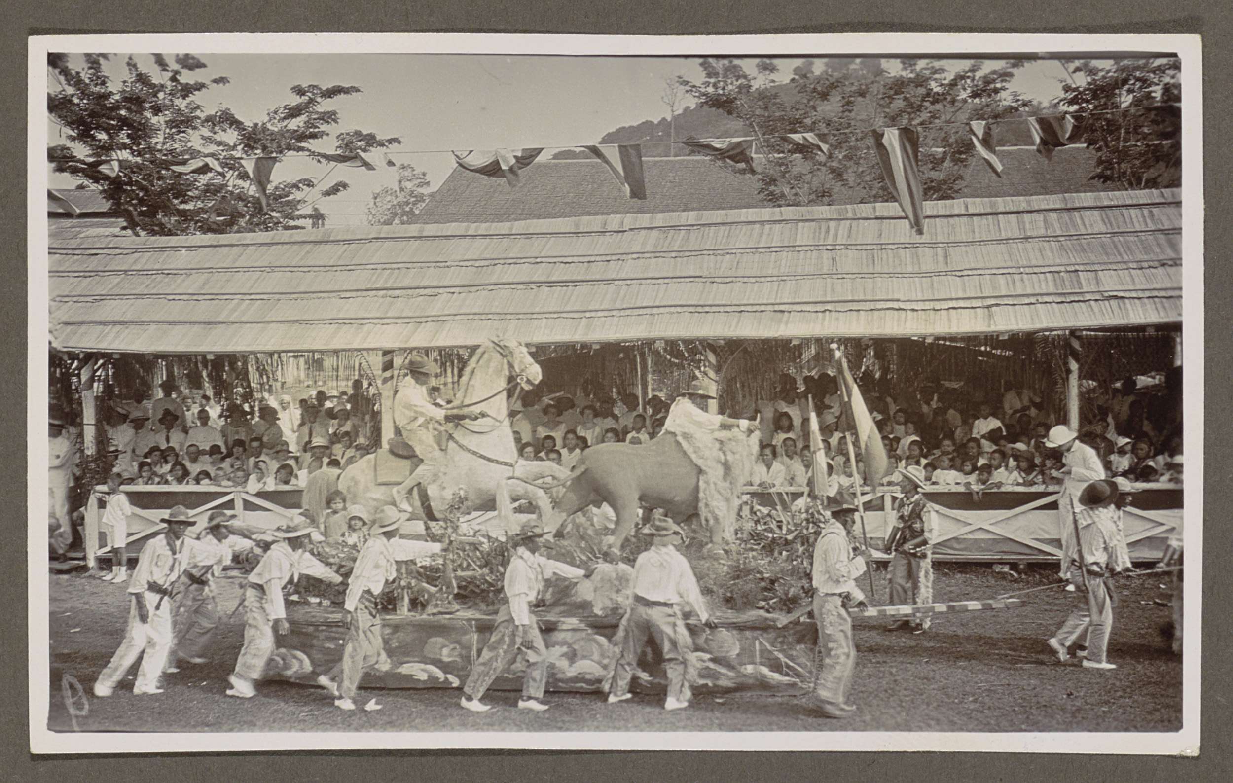 Optocht met deelnemers die ruiters uitbeelden voor e...