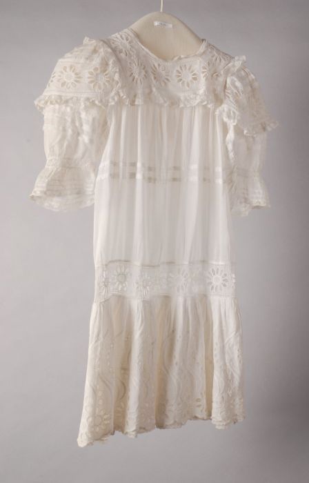 Kinderjurk van wit batist met broderie, vierkante ka...