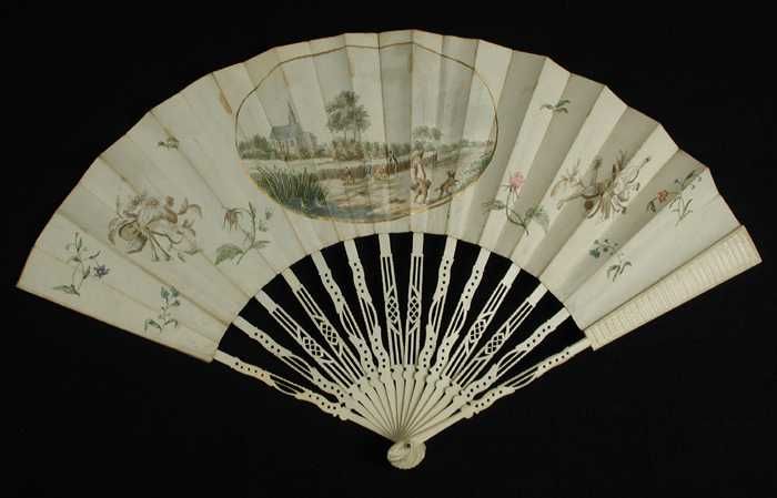 Vouwwaaier met in ovaal landschap met kerk en akker ...