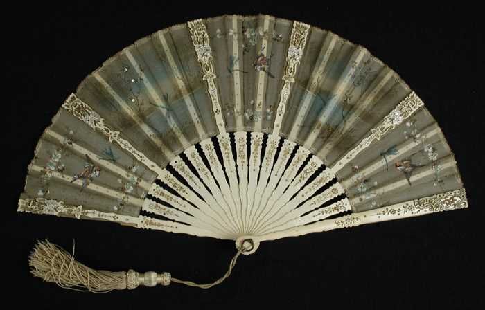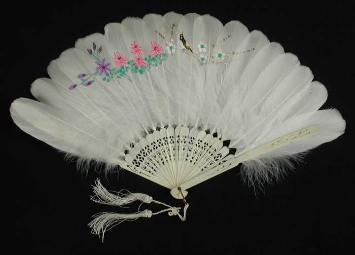 Briséwaaier van witte veren waarop beschildering vog...