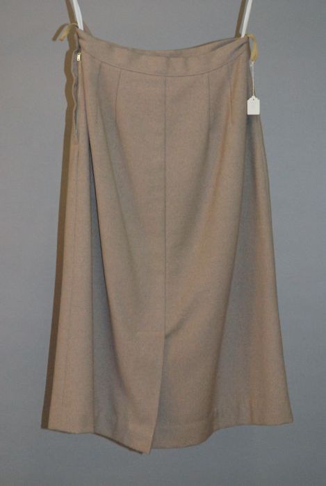 Tweedelige japon of mantelpak, beige jasje en rok