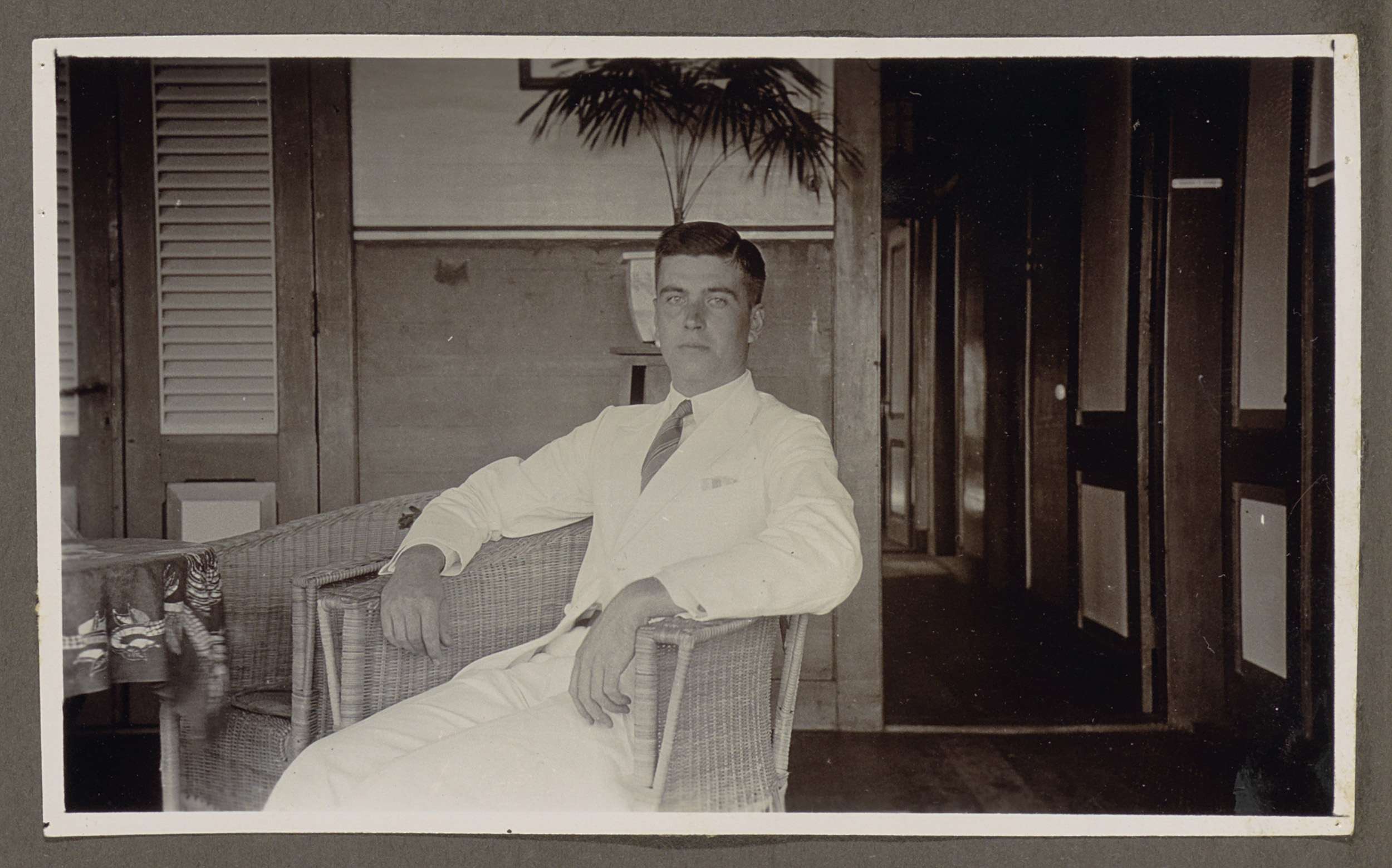 Man in een wit kostuum zittend in een rieten fauteui...
