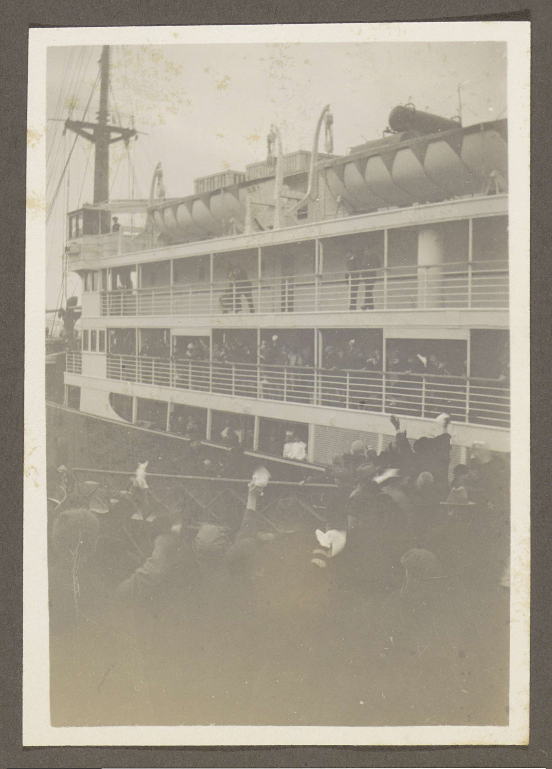 Wuivende passagiers op een schip en achterblijvers o...