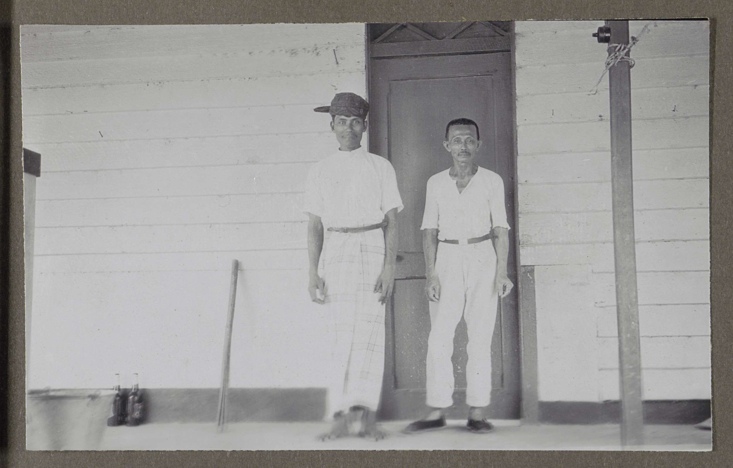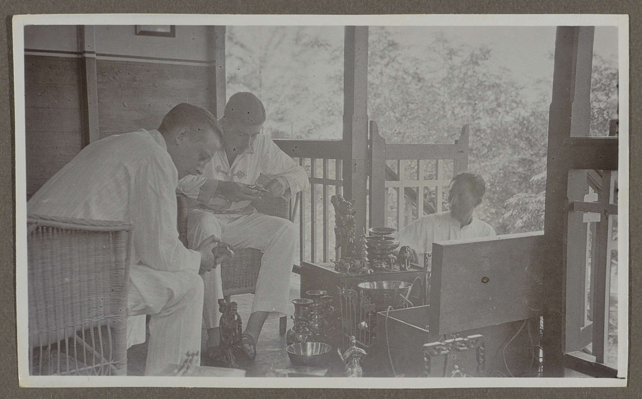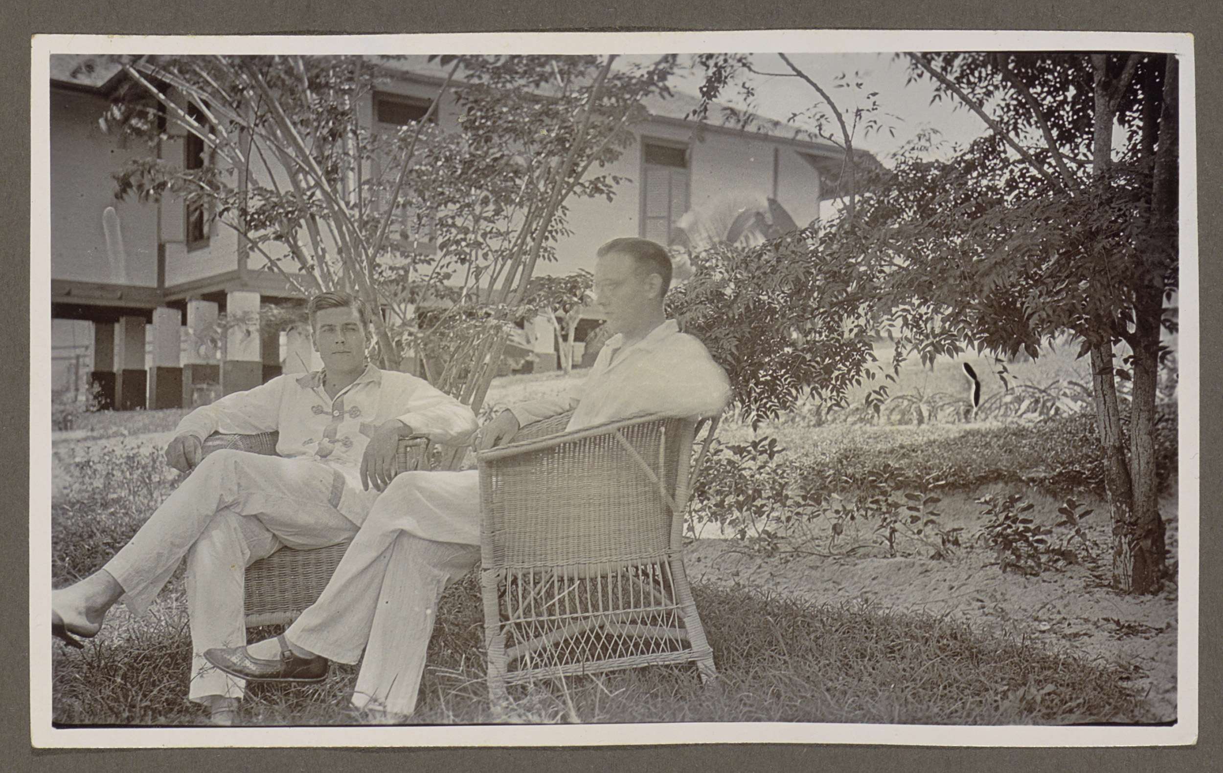 Twee mannen in witte kledij zittend in rieten fauteu...