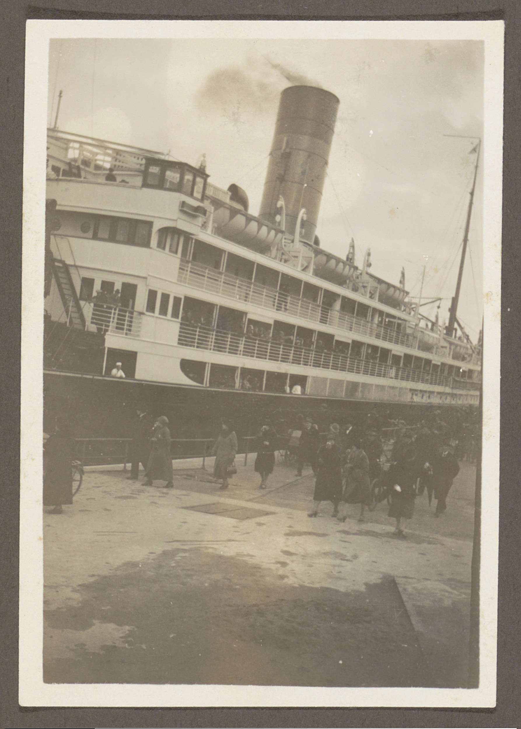 Mensen lopend over een kade naast een aangemeerd schip