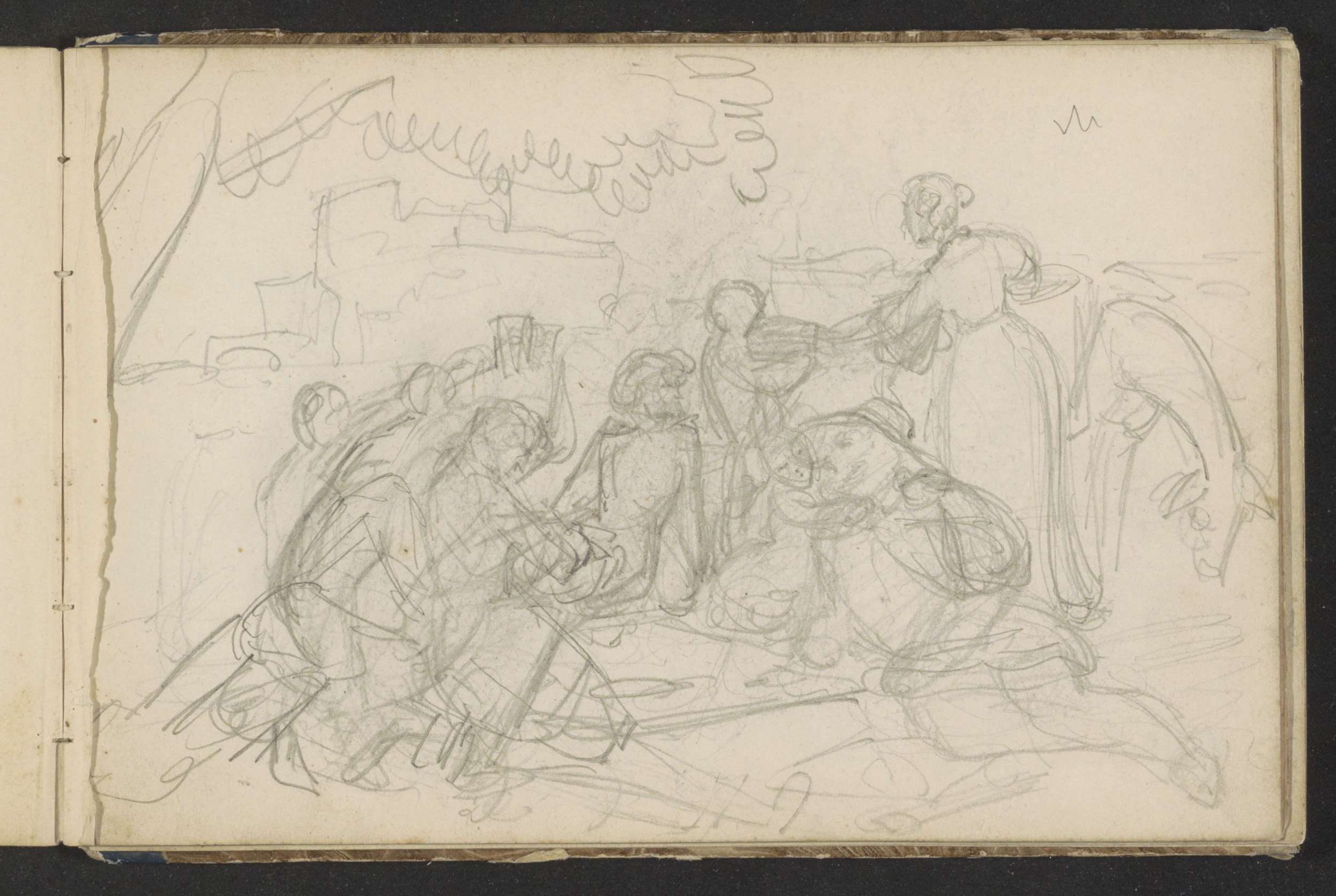 Landschap met een groep zittende en knielende figuren