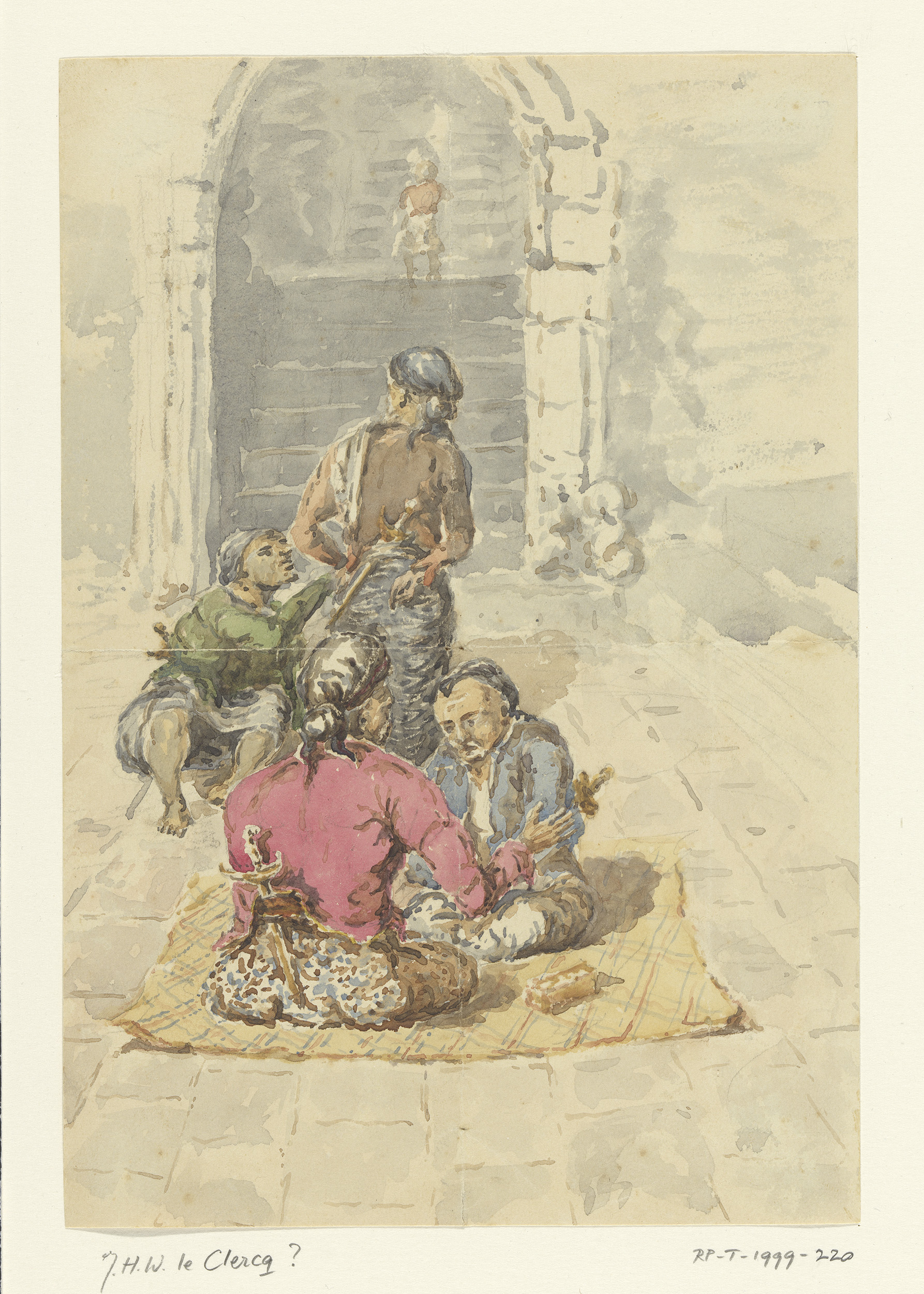 Ruitergevecht en een man met tulband en een figuur