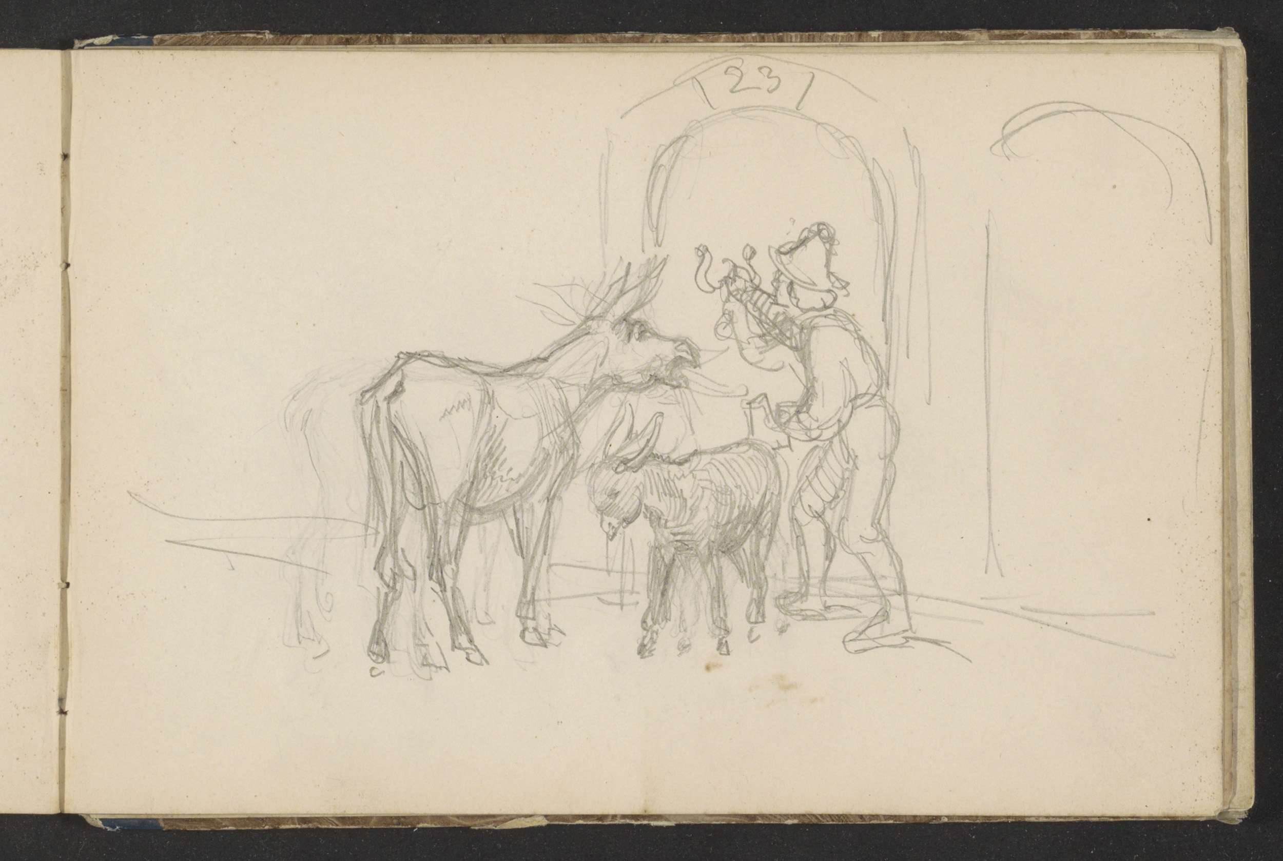 Man en twee ezels bij een poort