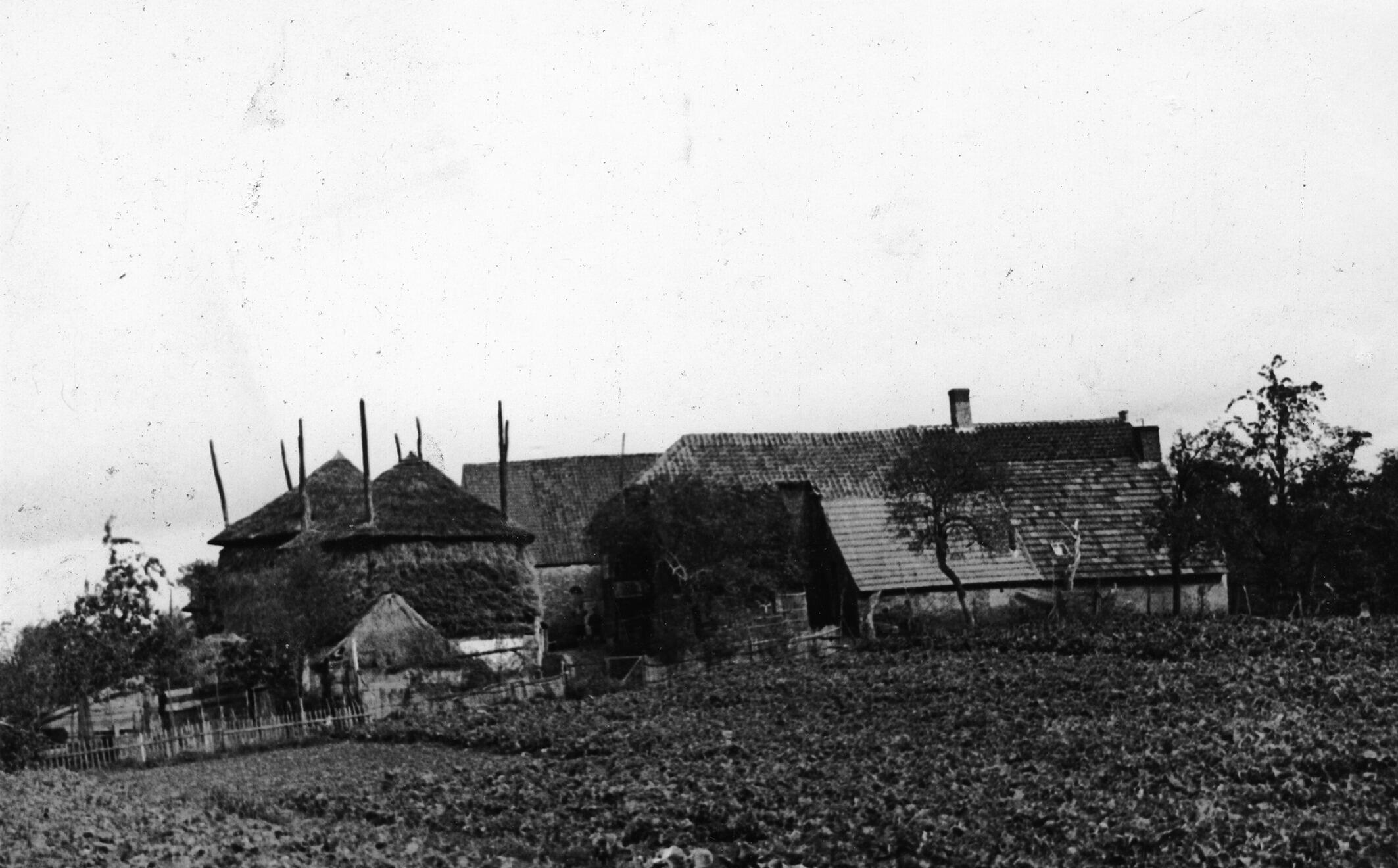 Boerenerf met hooibergen, Brakel, 1936 (zwart-wit foto)