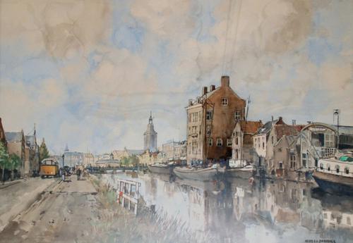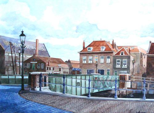 Aquarel. Gezicht op de Oudebrug en Oudehaven van Vla...