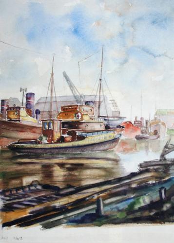 Aquarel. Hoflaan scheepsreparatie Vlaardingen.