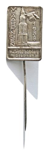 Speld. Rechthoekig draagspeldje met toren van de Gro...