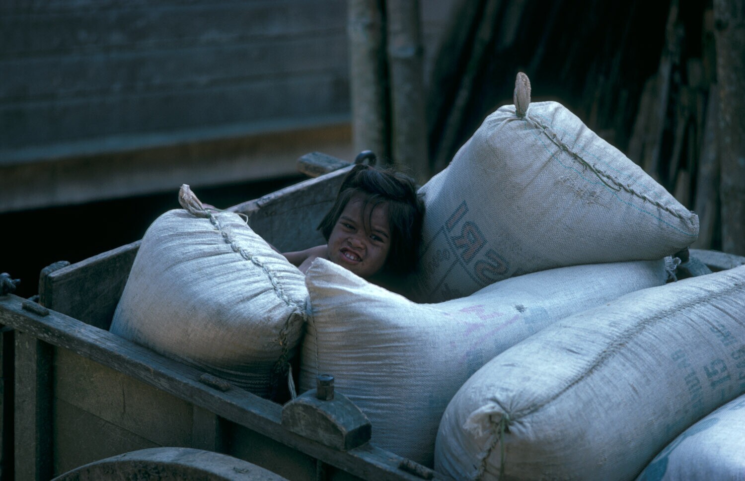 Een doerian-verkoper met zijn vruchten. Midden-Java.
