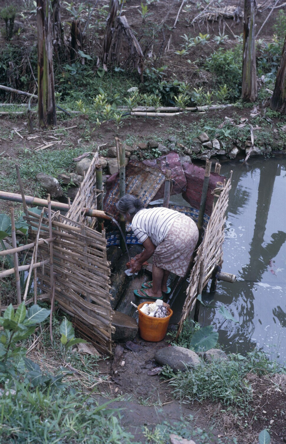 Vrouw doet de was. Het water komt uit een bamboe wat...