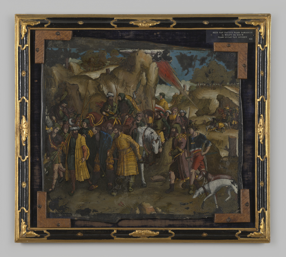 Tegel van keramiek met tinglazuur, voorstellende: De...