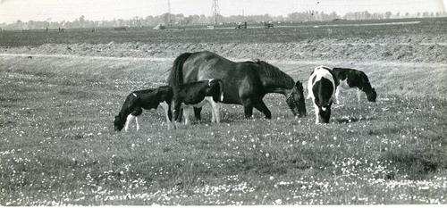 Foto in zwart-wit van pinken in een weiland bij Mirn...