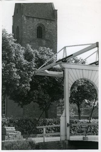 Foto in zwart-wit van een houten brug bij een kerk d...