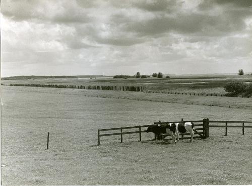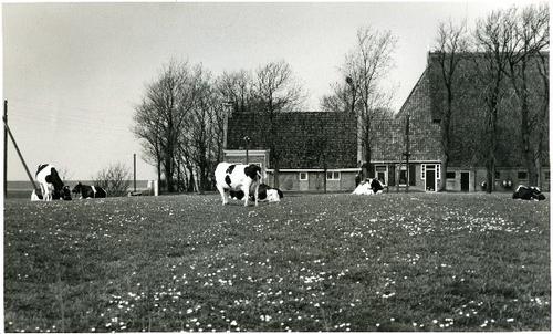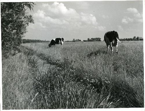Foto in zwart-wit van koeien in het weiland naast ee...