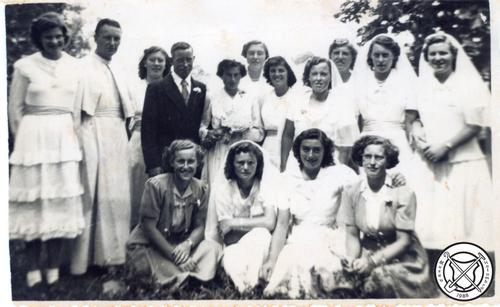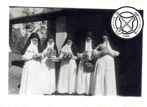 V.l.n.r., staand: mevr. Groot; mevr. Derks; mevr. Bruins; pater Paulinus; mevr. Schoenmaker; mevr. Clijsters; mevr. Bakker; mevr. van Schaik; mevr. J. de Wit; V.l.n.r., gehurkt: Cis Bos; Margriet Clijsters; Dina Eltink; Maria Jeuken. (2)