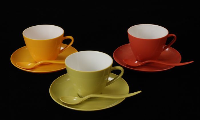 Zes schotels voor Van Nelle, met gele, blauwe en roz...