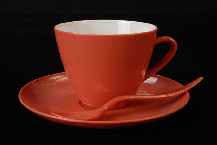 Oranjerode kop en schotel met lepeltje van Van Nelle...