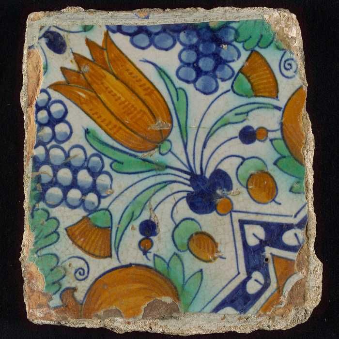 Ornamenttegel, stertulp met druiventrossen en oranje...