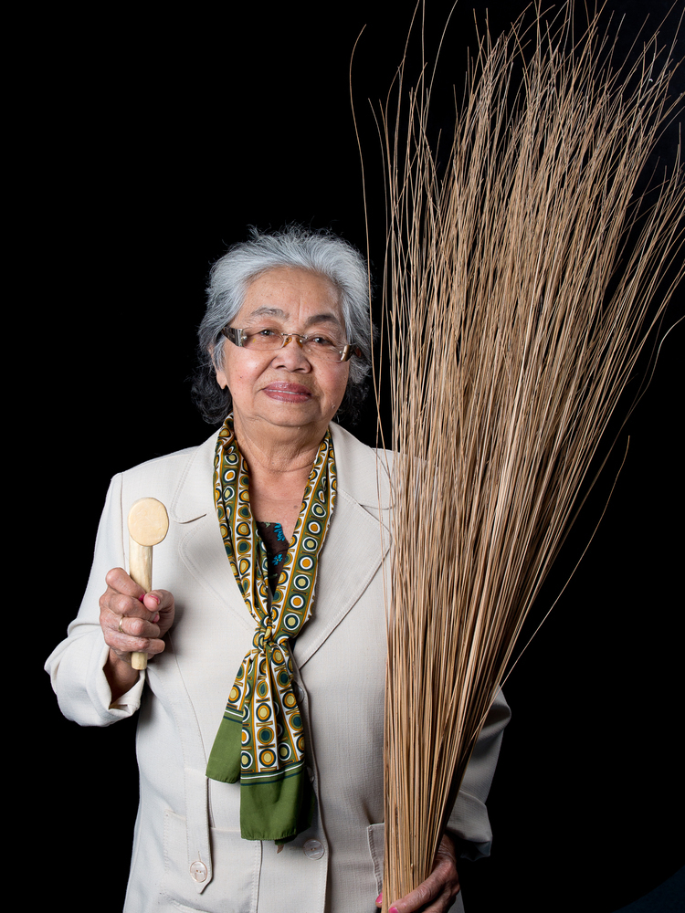 Het topstuk (houten vijzel (Muntu) en bezem) van Dja...